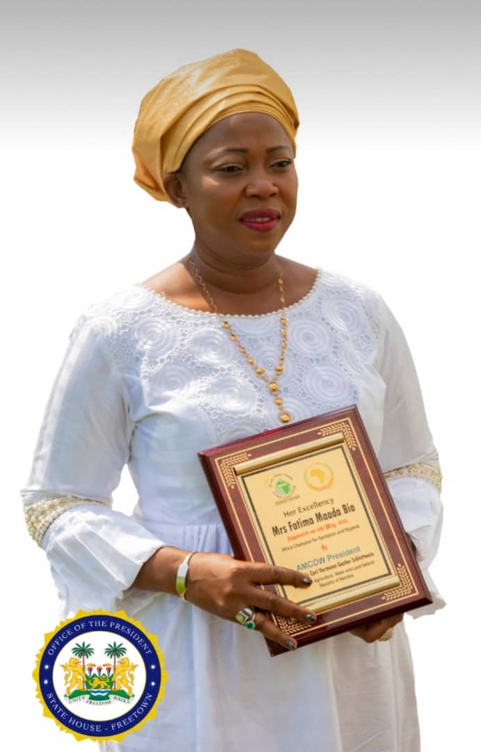 The African Ministers’ Council on Water (AMCOW) has recognised Sierra Leone’s First Lady, Fatima Maada Bio, as African Champion of Sanitation and Hygiene. She is the third prominent person to be honoured after Rwanda’s President, Paul Kagame and former President of Liberia, Ellen Johnson Sirleaf.